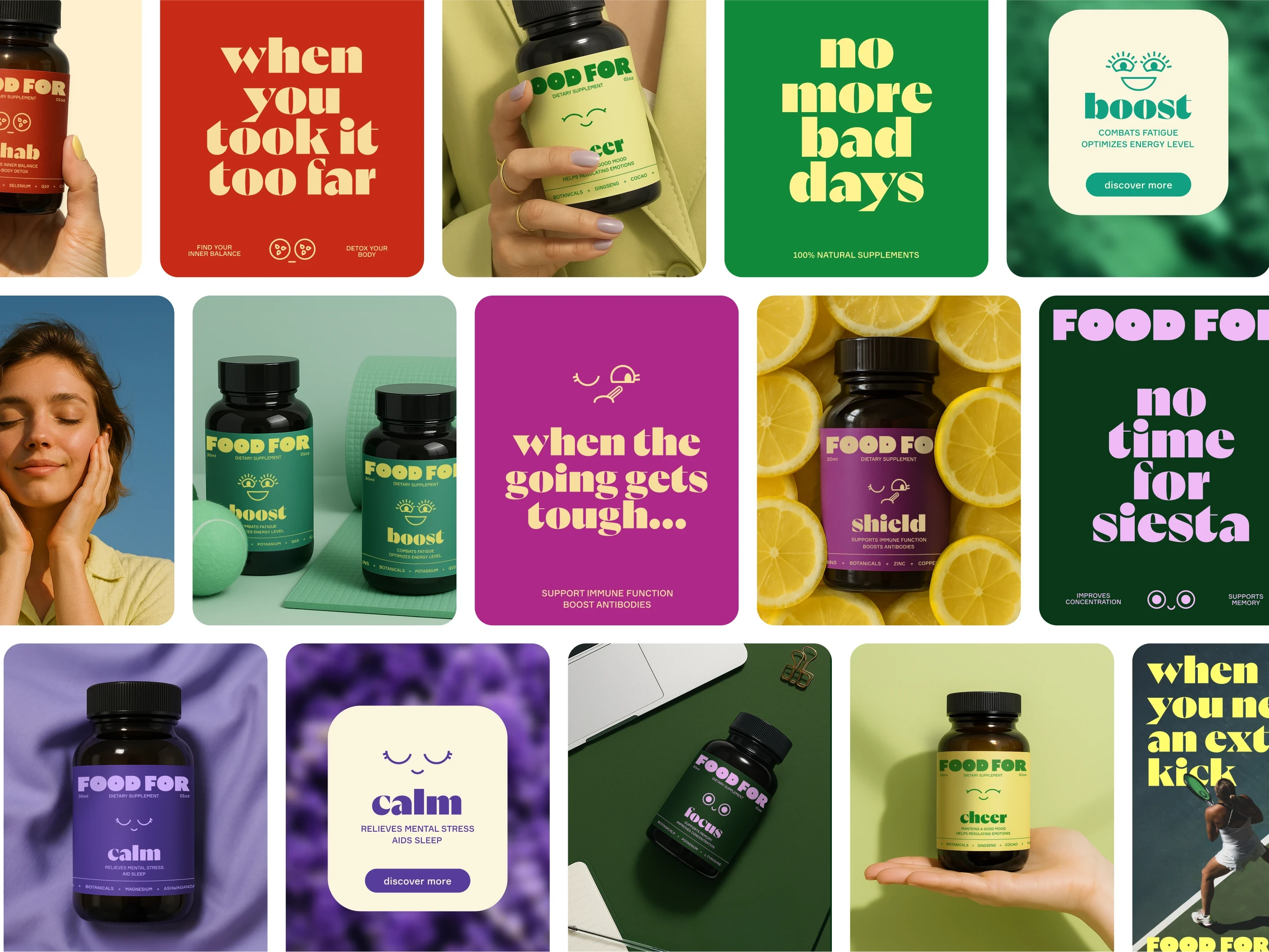 Each product has a main goal, which is highlighted with the use of typography and facial expressions illustrations, which are used very dominant on the labels in order to quickly catch the attention of the users.